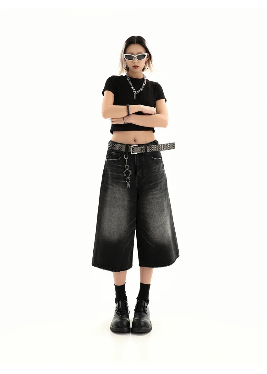 Retro Blue Knee Length Denim Shorts for Women Casual Bermuda Jeans Loose Wide Leg Pants Trendy Streetwear Summer Y2k 2025