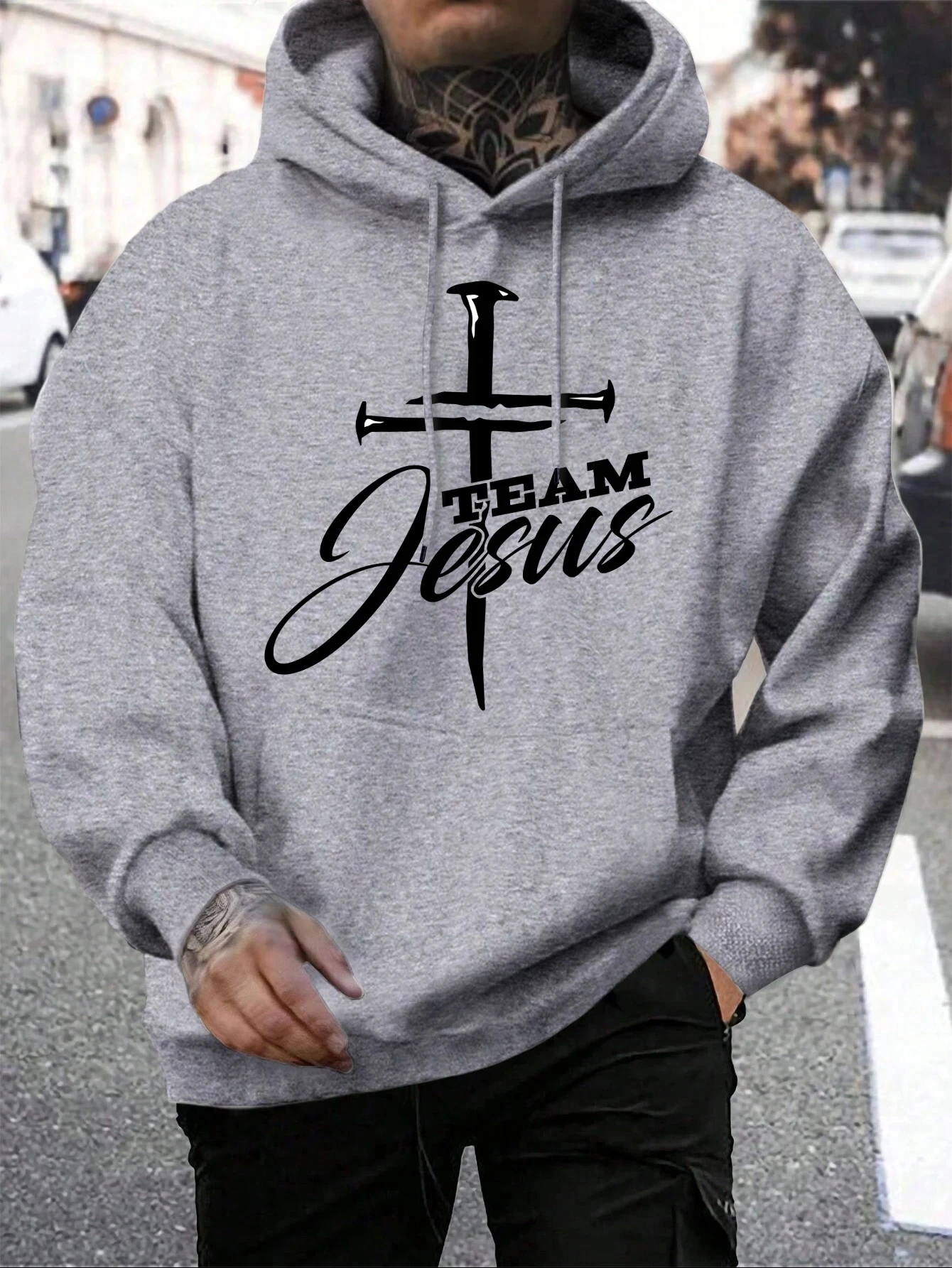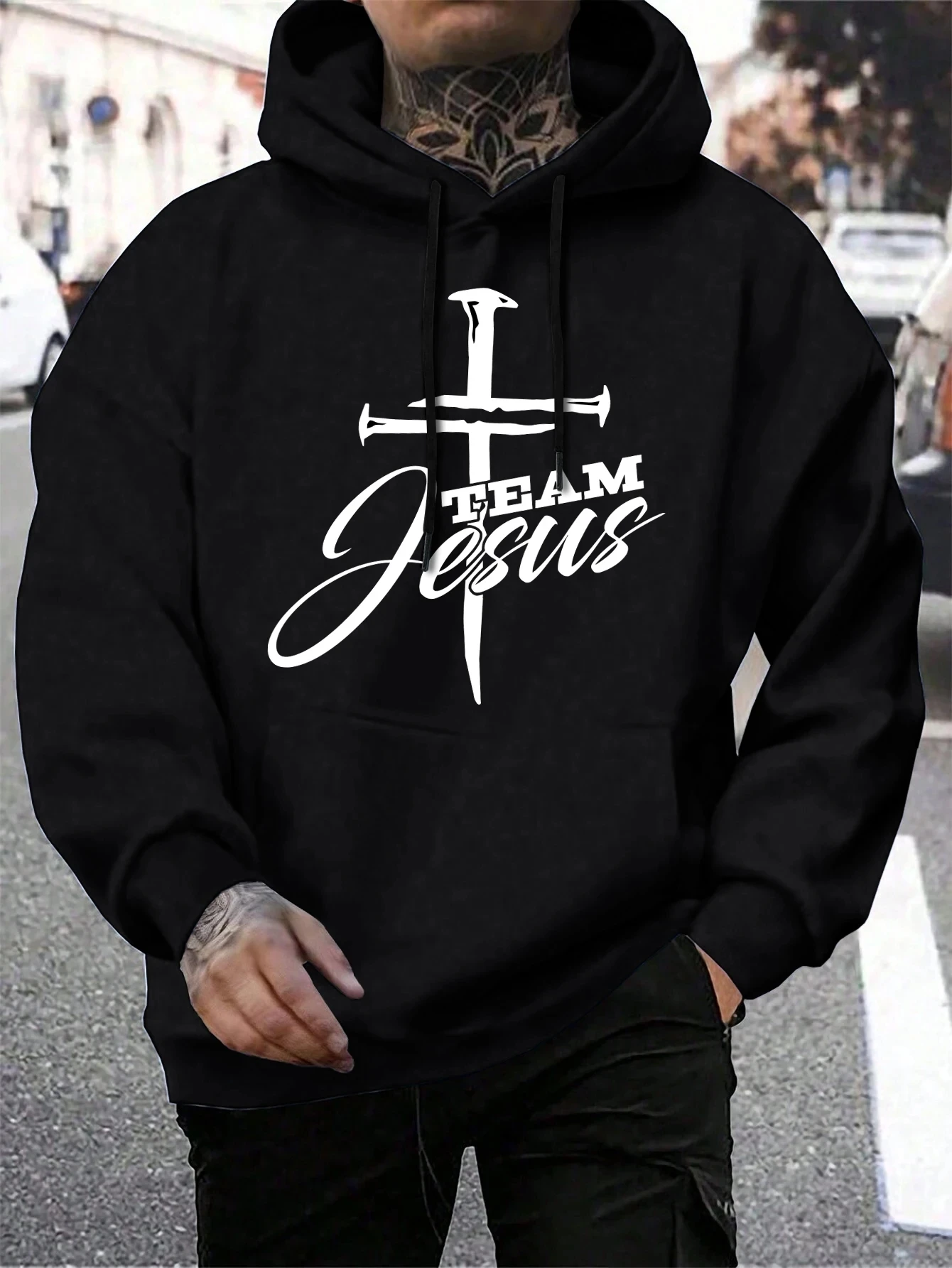 Team Jesus Letter Design Printing Men's Sweatshirt Fashion Warm Hooded Casual Pocket Hoodies Autumn Loose Streetwear